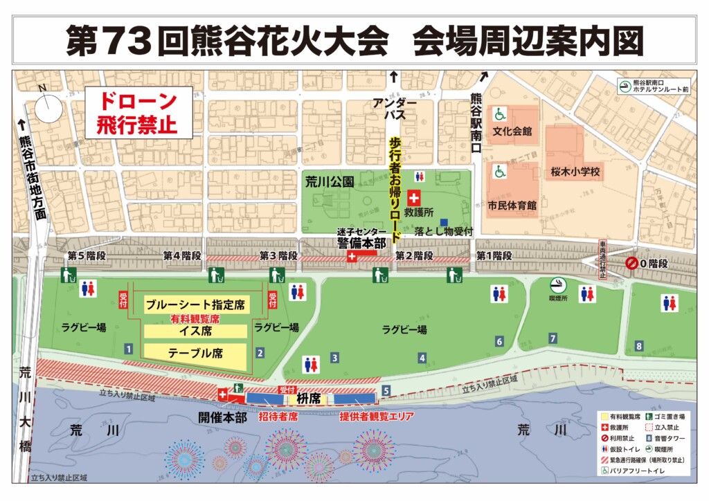 答:吸烟区也标示在【熊谷花火大会会场周边图】内,请提前确认。