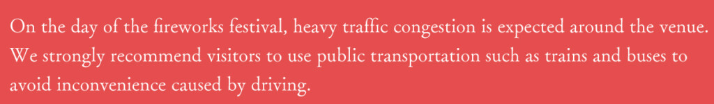 Please check the [Traffic  Map] before your visit, as road restrictions will be in effect around the venue. Be sure to allow plenty of time for arrival.