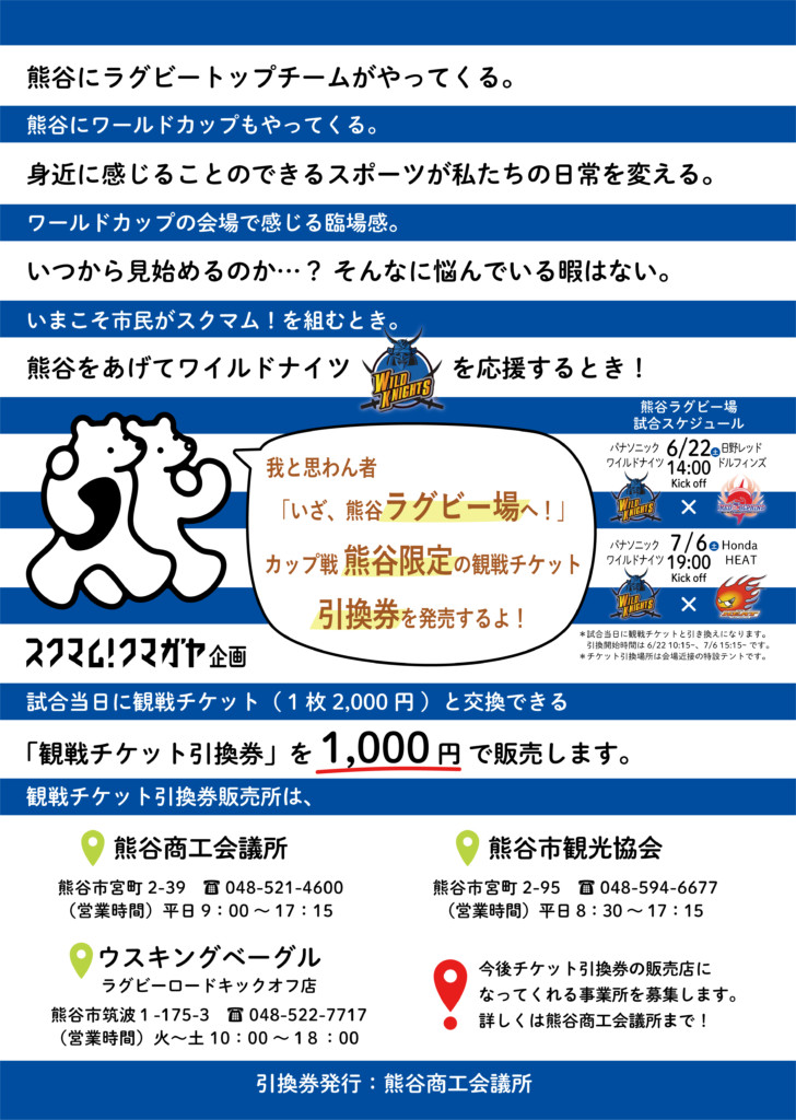 熊谷限定のお得な前売り引換券を販売しますので、ぜひパナソニックワイルドナイツを応援に行きましょう!