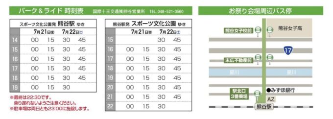 お祭り会場周辺の渋滞対策として、「熊谷スポーツ文化公園臨時駐車場」(西多目的広場)と「熊谷うちわ祭会場」を約15分間隔で無料送迎バスが運行します。(駐車場も無料です。)是非ご利用ください。