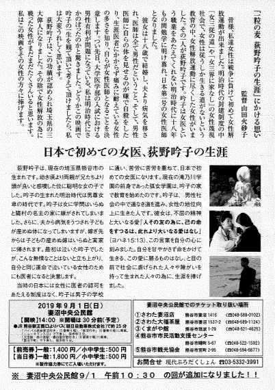 熊谷市出身で日本の女性医師第一号となった荻野吟子の生涯を描いた映画『一粒の麦 荻野吟子の生涯』。8月29日(木)のさいたま市を皮切りに、9月1日(日)には、妻沼中央公民館でも上映されます!