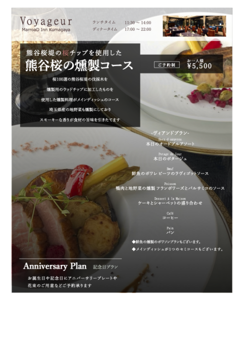 【マロウドイン熊谷】熊谷の桜チップを使用した燻製コースのご案内