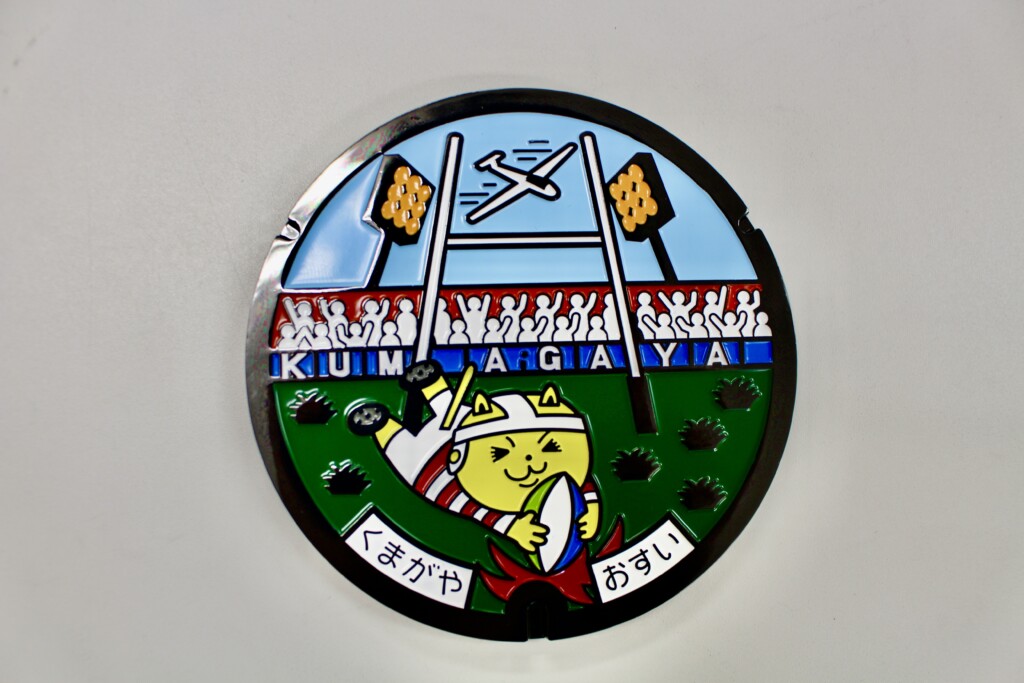 「スポーツくまがや」×「ニャオざね」がコラボしたご当地マンホールのデザイン。