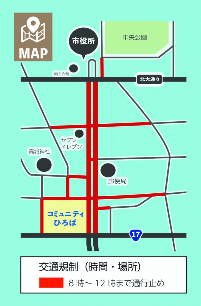 ◎交通規制 下記のとおり市役所通り周辺道路にて交通規制が行われる予定です。