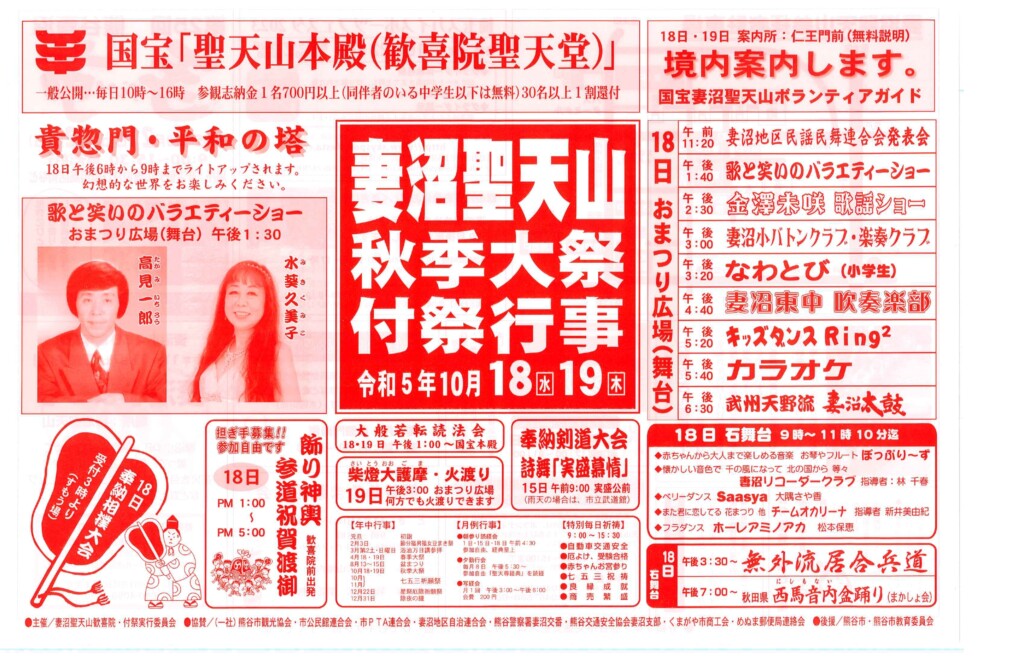 10月18日と19日の2日間、妻沼聖天山秋季例大祭が開催されます。