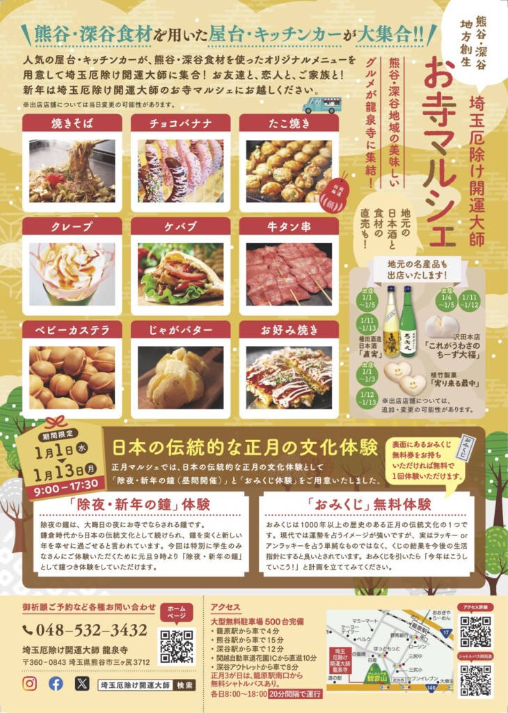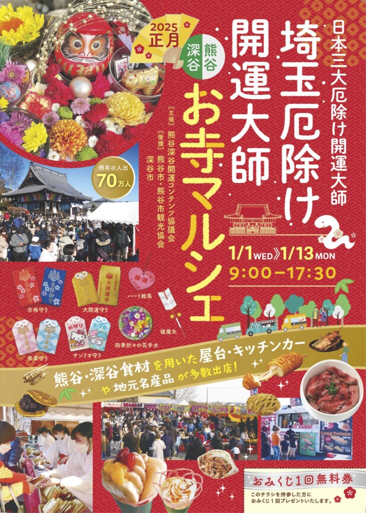 埼玉厄除け開運大師にて、1月1日(水)から13日(月)まで、熊谷・深谷お寺マルシェが開催されます。