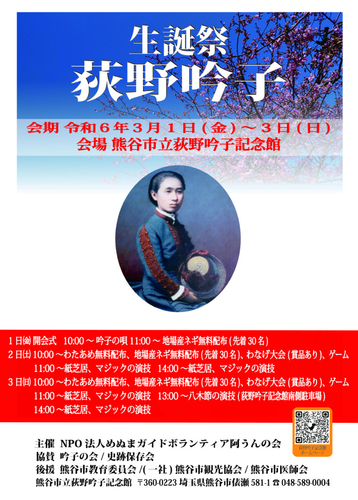 【会 場】 熊谷市立荻野吟子記念館(住所:熊谷市俵瀬581-1、電話:048-589-0004)
