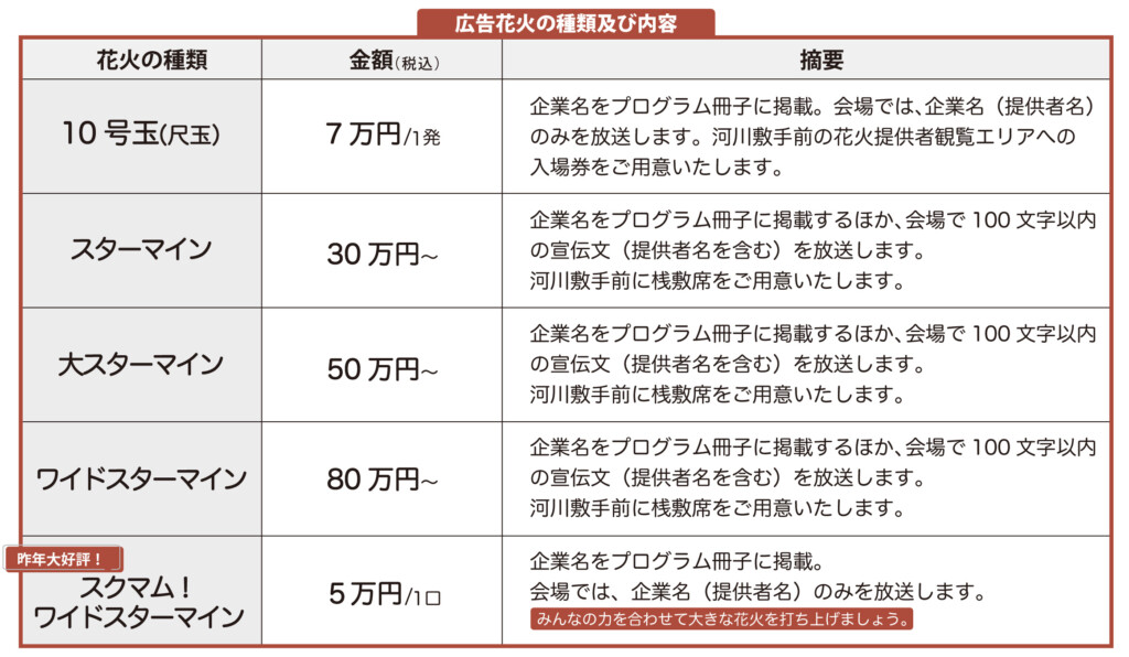 今年も例年通りに、企業・団体様向けの①広告花火、②プログラム冊子広告の協賛コースと、個人様向けの③メッセージ花火の協賛コースをご用意したほか、有料観覧席等をリターン品にした『スクマム!ワイドスターマイン』のクラウドファンディングも行います。