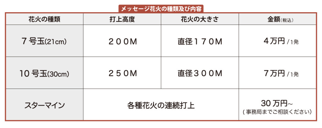 大切なあの人に花火にのせたメッセージを贈りませんか?メッセージは当日会場にて放送し、市内全戸配布の花火大会プログラム冊子に掲載します。プロポーズ・出産・誕生・入学・卒業・就職・還暦・新築・創立等メモリアルなお祝い事、その他広くPRにいかがでしょうか?