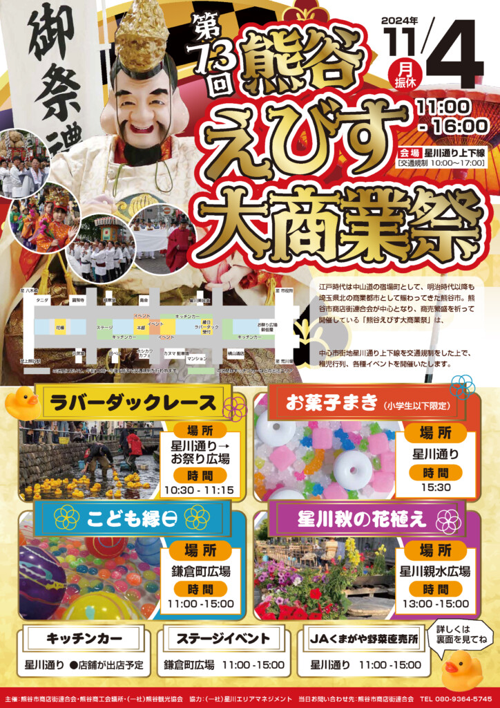 商売繁盛を願って行われるお祭り、「熊谷えびす大商業祭」が10月31日(木)〜11月4日(月・振休)に開催されます。11月4日(月・振休)には熊谷市中心市街地の星川通りを会場に、例年多くの来場者で賑わう商店街イベントも開催されます。