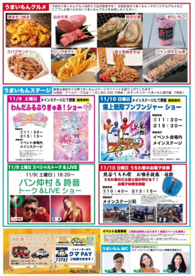 全国のさまざまなうまいもんグルメが、約50品登場予定で遠出をしないと食べられないグルメもあります。ステージイベントも同時開催されますので、この機会にぜひ熊谷にお越しください!