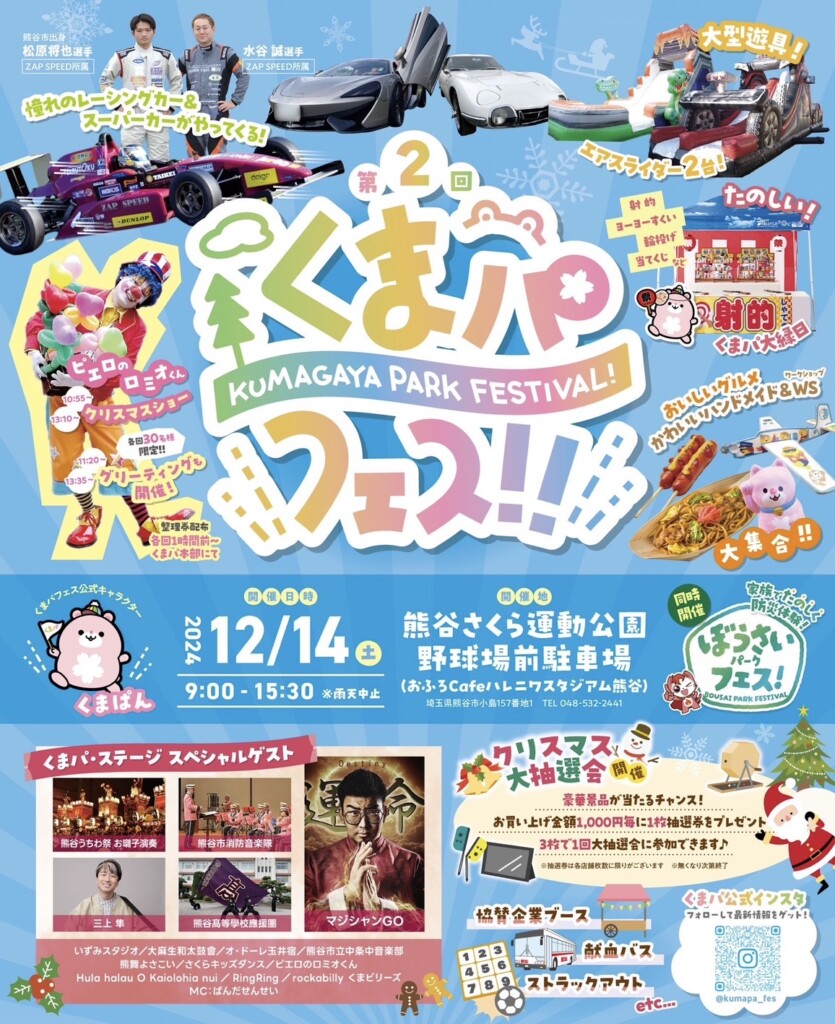熊谷さくら運動公園で『第2回くまがやパークフェスティバル』が行われます。ステージイベントの他にクリスマス大抽選会なども実施されます。防災について学べる『ぼうさいパークフェスティバル』も同時開催されますので、家族やお友達を誘ってお出かけしてみませんか。