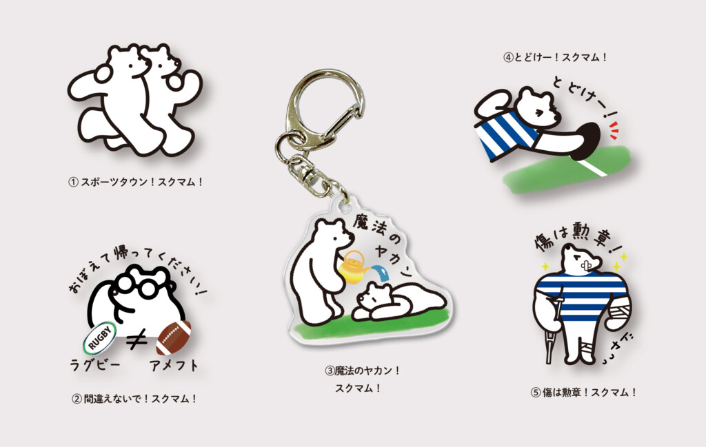 「間違えないで!スクマム!」「魔法のヤカン!スクマム!」「とどけー!スクマム!」「傷は勲章!スクマム!」は競技者も観戦者も思わずうなずいてしまうラグビーあるあるな絵柄。
