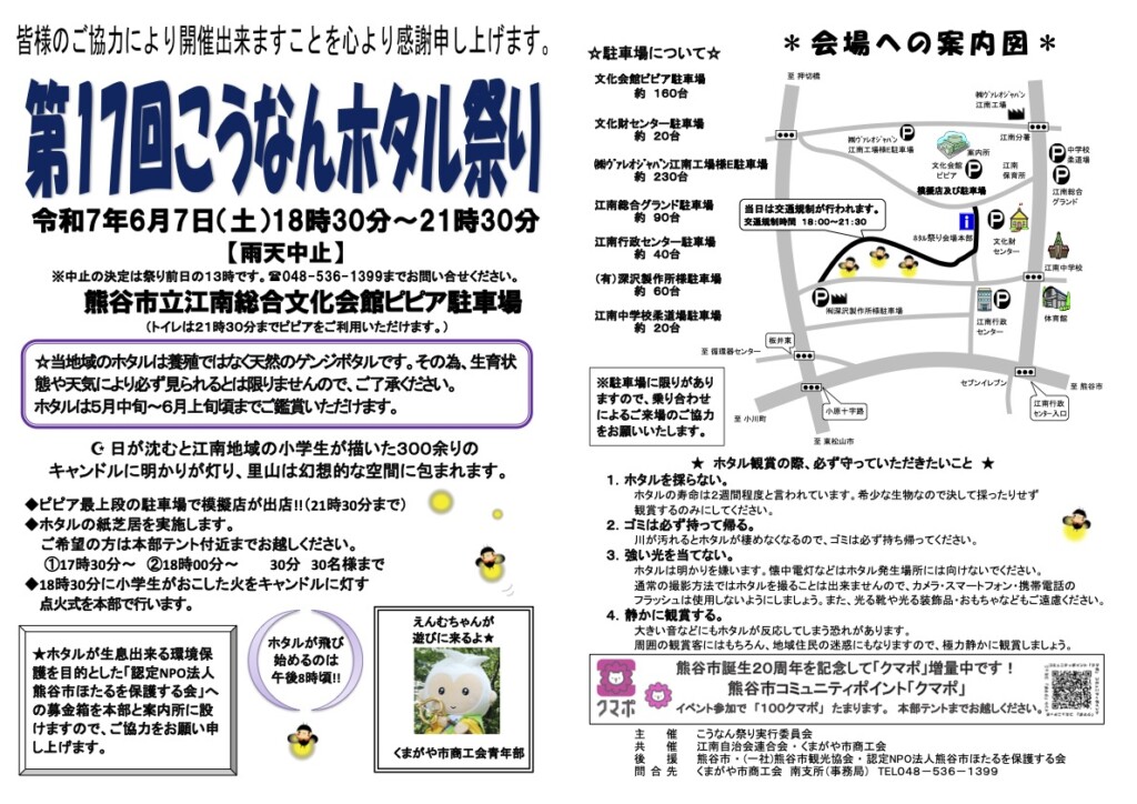 ホタルの紙芝居や模擬店が出店するほか、熊谷市めぬま縁結びキャラクターのえんむちゃんも来てくれます。