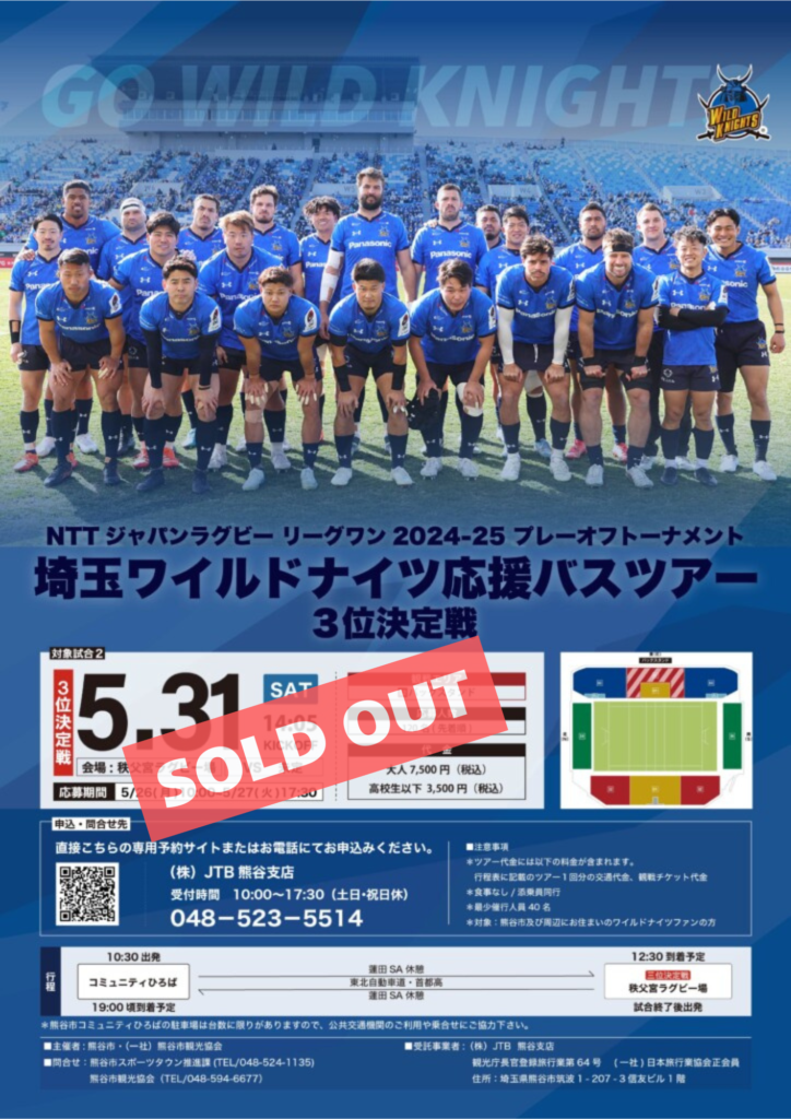 埼玉ワイルドナイツ応援バスツアー(5/31 3位決定戦)のチケットは完売いたしました。