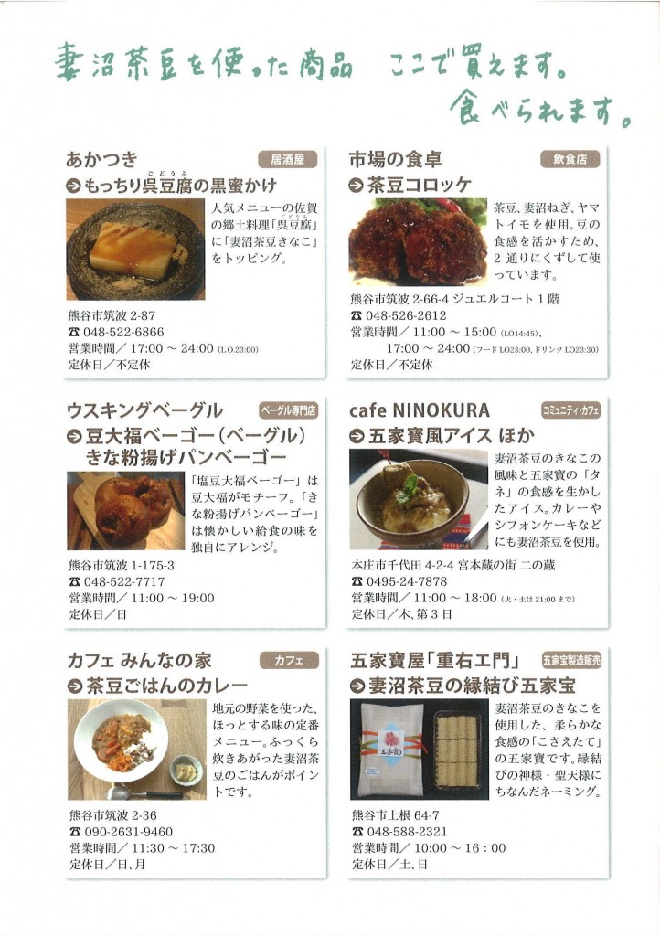妻沼茶豆の特徴や由来、会員店舗の個性的なメニューをはじめ、栄養価の分析まで、載ってます。