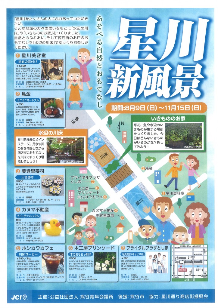 「あそべる自然とおもてなし」をキーワードに、公益社団法人 熊谷青年会議所が 星川に2つ目の川床となる「水辺の川床」や「いきもののおうち」を設置します。