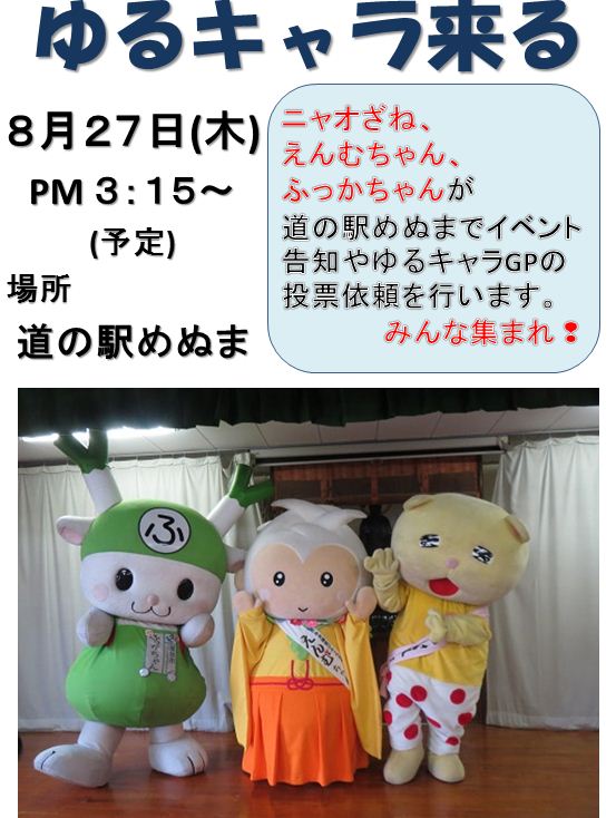 熱き一票を!! ニャオざね、えんむちゃん、ふっかちゃんが「道の駅めぬま」に集合。