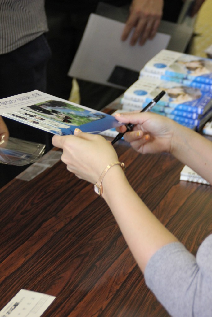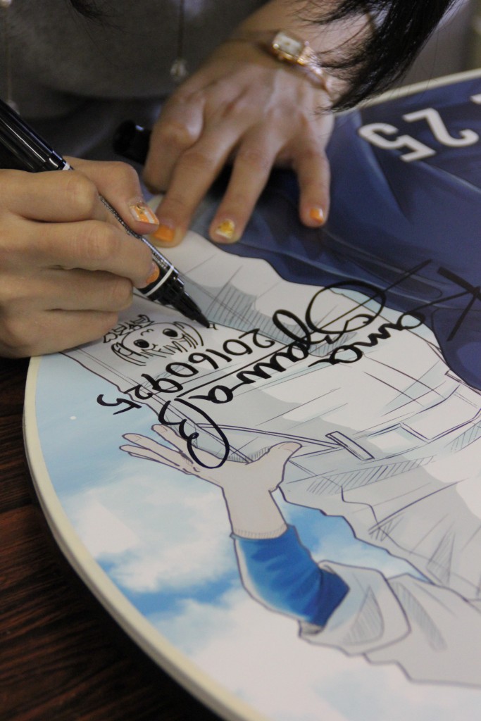 サイン会に先立ち、ヘッドマークにサインをする小沢かな先生。ネイルがオシャレです!