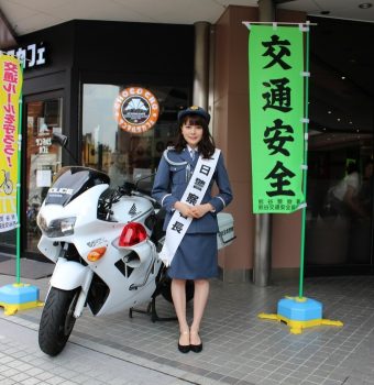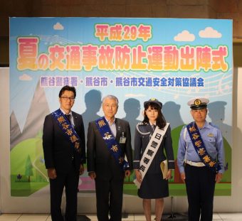 ニットーモールイベント広場にて、熊谷市出身・高橋胡桃さんが一日警察署長に任命されました!(夏の交通事故防止運動出陣式)