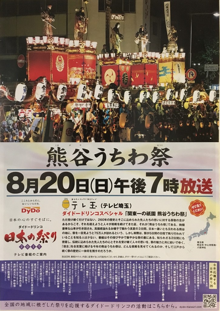 【TV放映情報】『ダイドードリンコスペシャル「関東一の祇園 熊谷うちわ祭」』(8月20日(日))