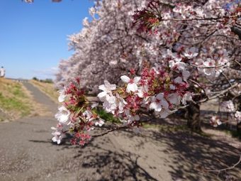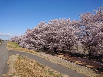 晴天の熊谷桜堤。青空に桜が映えます。