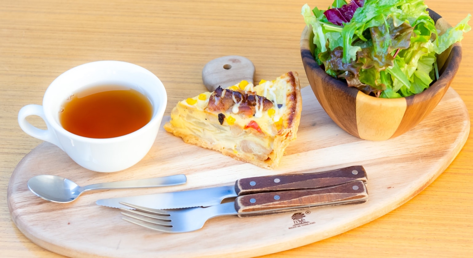 アップルパイのほか、昼食にもぴったりのキッシュは2種類ほどが日替わりで登場。おしゃれな雰囲気のカフェスペースでは、自家製バニラアイスとドリンクがついたアップルパイセット(880円税別)やサラダとドリンクがついたキッシュセット(同)などを提供しているので、ゆったりと味わいたい人はこちらがおすすめです。